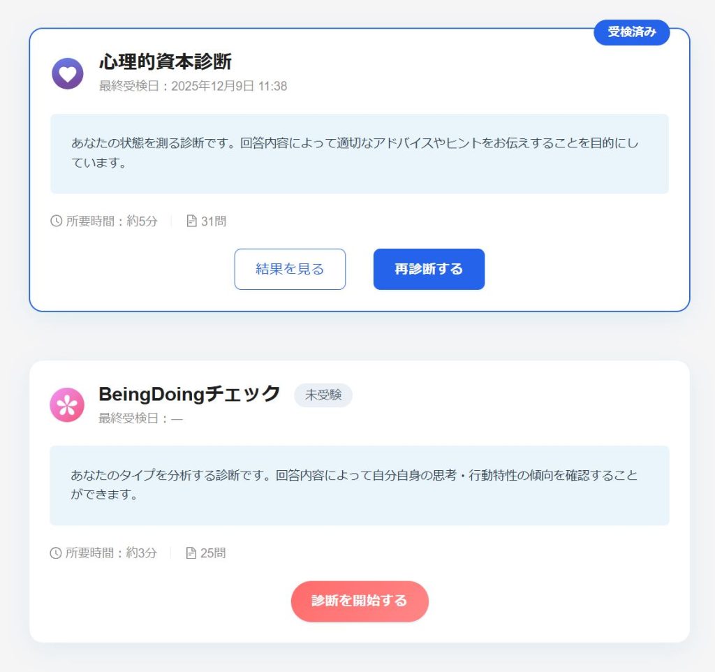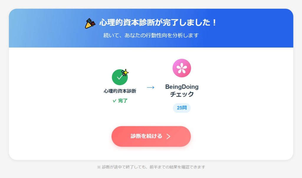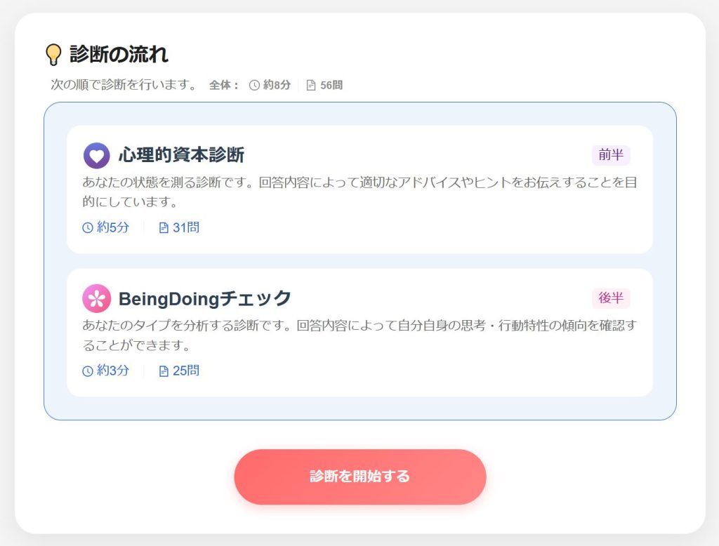 心理的資本診断の設問を前半に、BeingDoingチェックの設問を後半に回答し、2つの診断をシームレスに受検