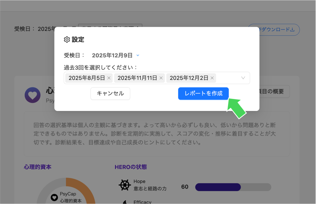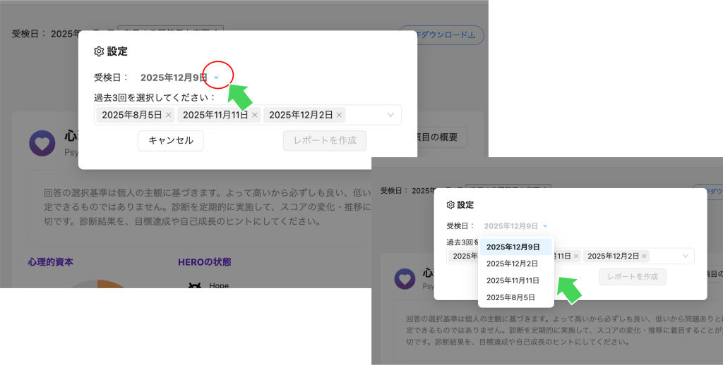 この3回の日程を他の受検日に変更する場合は、「過去3回を選択する」の欄で、任意の受検日に選択しなおして「レポートを作成」をクリックします。